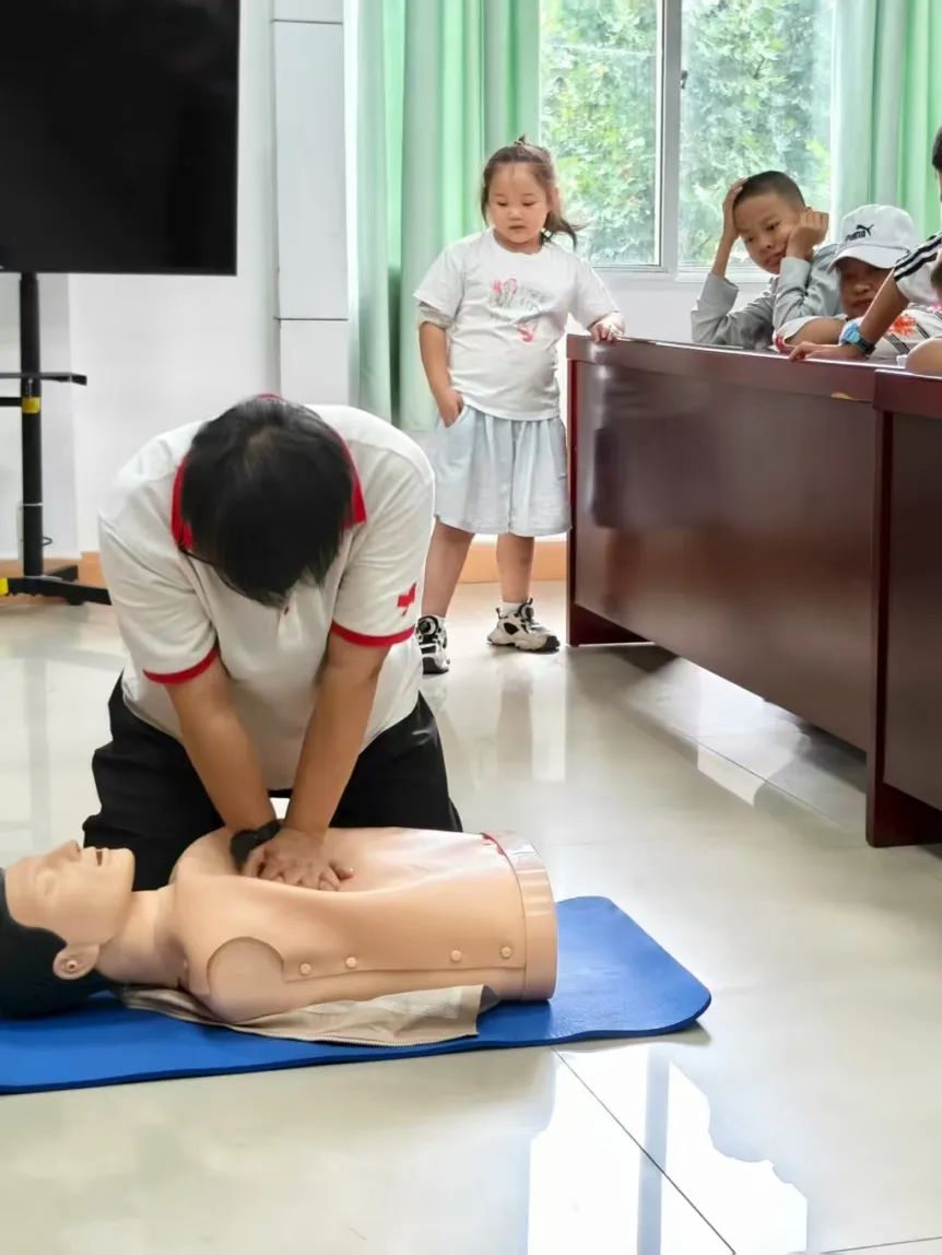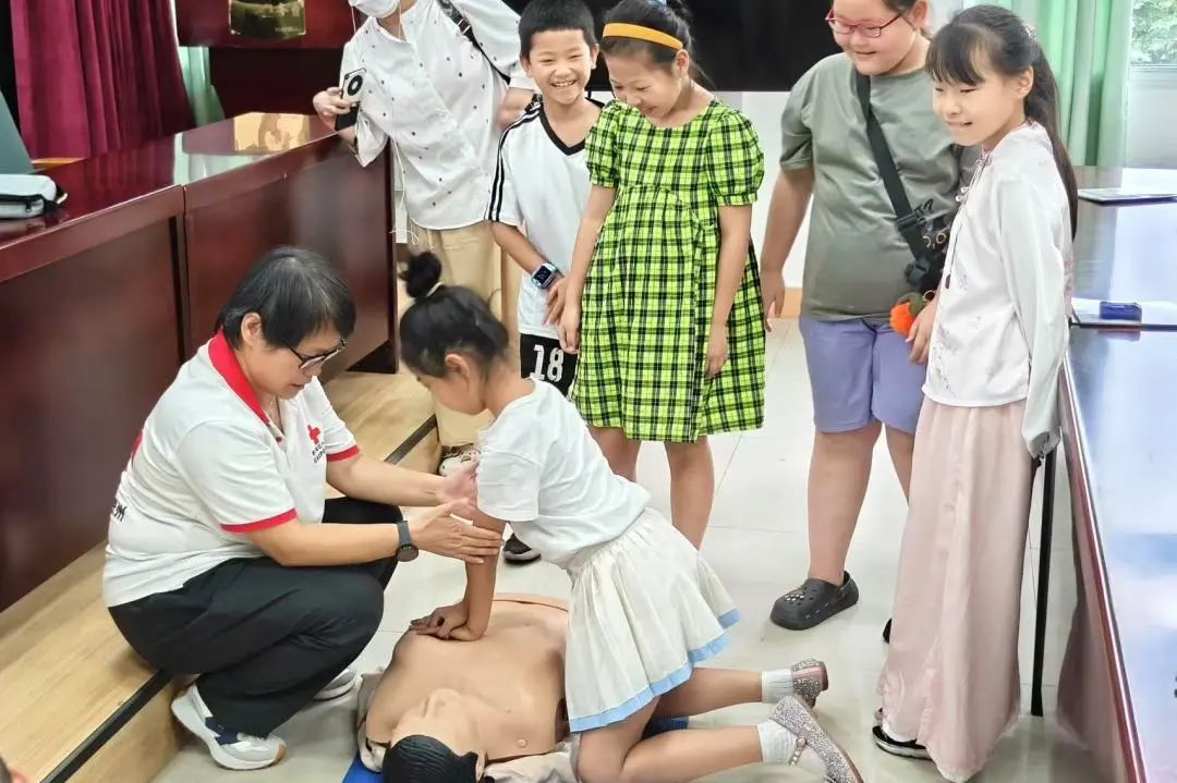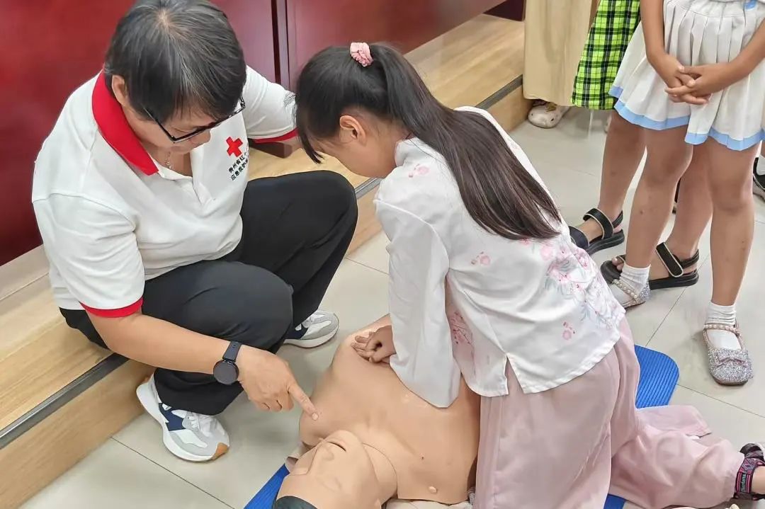 众援红十字志愿服务中心黄老师现场示范心肺复苏术(CPR),家长与孩子们分组实操演练,掌握突发状况应急处理方法。