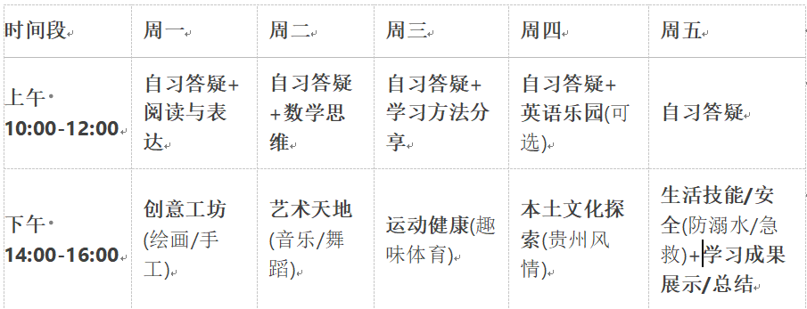 课业辅助:上午时间段10:00—12:00以“课业辅导”为核心。集中自习和答疑,学生自主完成暑假作业或进行复习预习。社工/志愿者巡视或辅导
